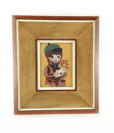STARI GOBLEN U DRVENOM RAMU, DEČAK | Stari goblen u drvenom ramu iz sedamdesetih godina prošlog veka sa motivom dečaka dimenzije 26.5 x 30 i unutrašnjim delom 11 x 15 centimetara. Predmete šaljem post expresom ili tiskovinom ako ima potrebe. Za dodatne informacije i fotografije slobodno pitajte.