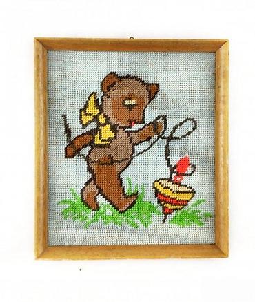 STARI GOBLEN U DRVENOM RAMU, MEDVEDIĆ SA ČIGROM | Stari goblen iz sedamdesetih godina prošlog veka sa motivom medvedića sa čigrom dimenzije 20 x 22 centimetra. Predmete šaljem post expresom ili tiskovinom ako ima potrebe. Za dodatne informacije i fotografije slobodno pitajte.