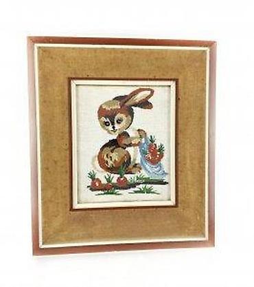 STARI GOBLEN U DRVENOM RAMU, ZEC | Stari goblen u drvenom ramu iz sedamdesetih godina prošlog veka sa motivom zeca dimenzije 38.5 x 34 i unutrašnjim delom 23 x 18.5 centimetara. Predmete šaljem post expresom ili tiskovinom ako ima potrebe. Za dodatne informacije i fotografije slobodno pitajte.