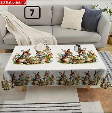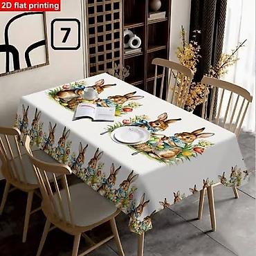 - Dekorativni stolnjak sa printom uskršnjih zečića, korpe sa jajima, lala i prolećnog cveća