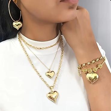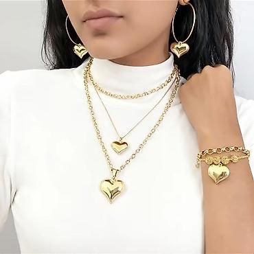 - Komplet sadrži: par velikih kružnih minđuša sa visećim srcem, dve ogrlice u slojevima sa privešcima u obliku srca (jedna finiji lančić, druga masivniji karika-lanac) i narukvicu sa karikama, dekorativnim kuglicama i srcem priveškom.