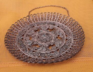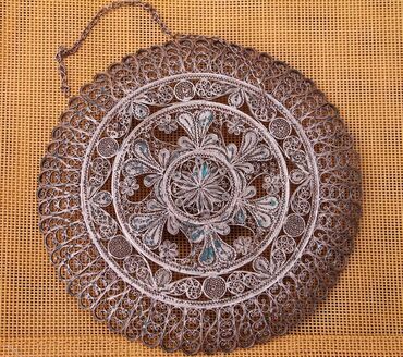 Retko viđen primerak filigranski obrađenog bakarnog tanjira, ručno rađen, sa vrlo složenim dekorativnim motivima perforacije i gravure. Takva tehnika obrade bakra ukazuje na visok nivo zanatskog umeća koje nije tipično za masovne suvenire. Predmet ima karakter dekorativnog ukrasa i pogodan je za zidnu prezentaciju u tradicionalnim ili modernim enterijerima.