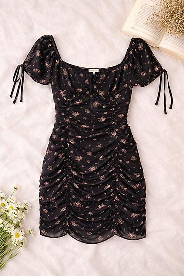 Crna mini haljina s cvetnim printom - Model: romantična, uska mini