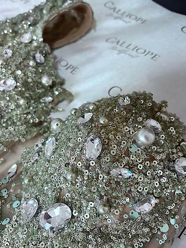 - Aplikacije: gusto ručno našiveni zeleni šljokice i sitne perlice, kristalni kamenčići različitih veličina (kapljice/ovaloidni/fasetirani) i imitacije bisera. Dekor formira reljefne, organske šare koje prate liniju tela.