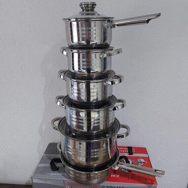 - Sastav seta: više lonaca i šerpi različitih zapremina + džezva/tiganj-sać sa dugom drškom (vidljivo na fotografijama), svaka posuda dolazi sa poklopcem.