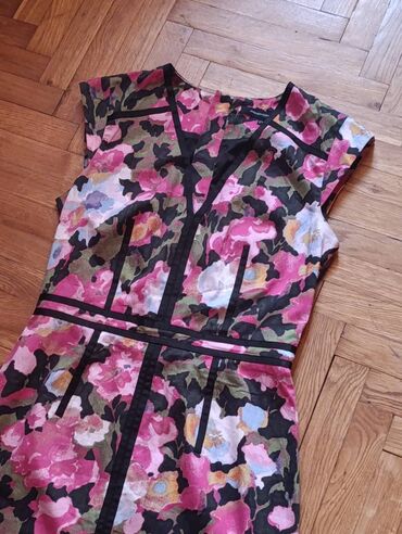 Ženska odeća – više modela 1) Haljina Just Woman, veličina M/L - Floralni print, V-izrez, kratki rukavi - Elastičan struk sa trakicama za vezivanje - Dužina: 100 cm - Poluobim: 32–60 cm - Cena: 10...500 RSD