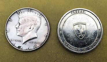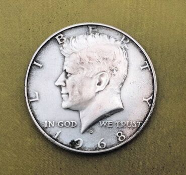 Originalni američki Kennedy half dollar iz 1968. godine, sa oznakom D koja označava kovnicu Denver. Ovaj primerak pripada posebnoj seriji iz perioda 1965–1970, kada su half dollari kovani od 40% srebra, nakon povlačenja punog srebra iz opticaja. Upravo zbog tog prelaznog perioda, ovi novčići imaju i numizmatičku i realnu metalnu vrednost.