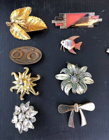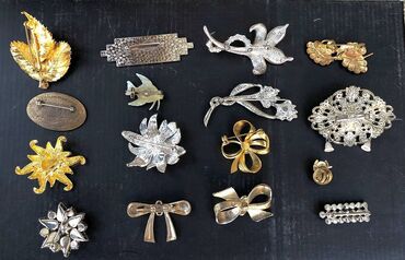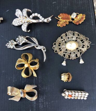 Svaki broš je izrađen u klasičnom mid-century stilu: cvetni motivi, emajl, rhinestones, filigran i pozlata.