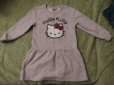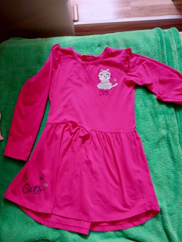 - Roze pamučna haljinica dugih rukava, meka i rastegljiva, sa ukrasnim volančićem na ramenima, vezanom trakicom u struku i motivom mace i natpisom “Cats” napred i pri porubu. Prijatna za svaki dan.