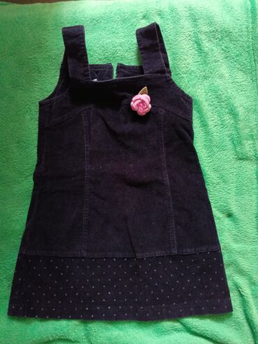- Tamna teksas/keper haljinica na bretele, jednostavnog A kroja, sa dekorativnom roze cvetnom broš-kopčom na grudima i diskretnim tufnastim porubom pri dnu.