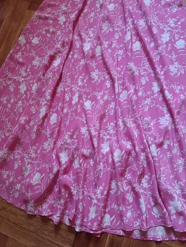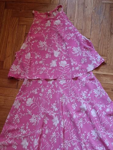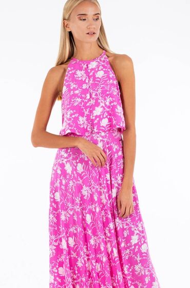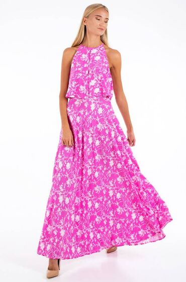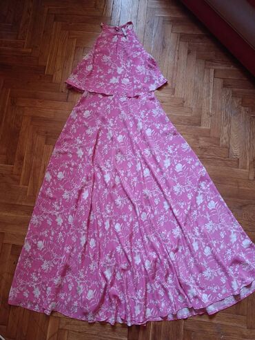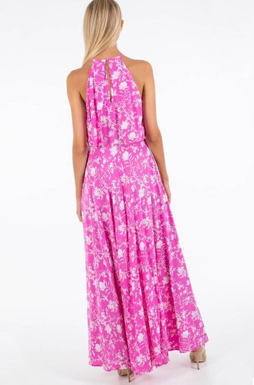 Prelepa tamnije roze maxi haljina sa sitnim belim cvetovima, lagana i elegantna.