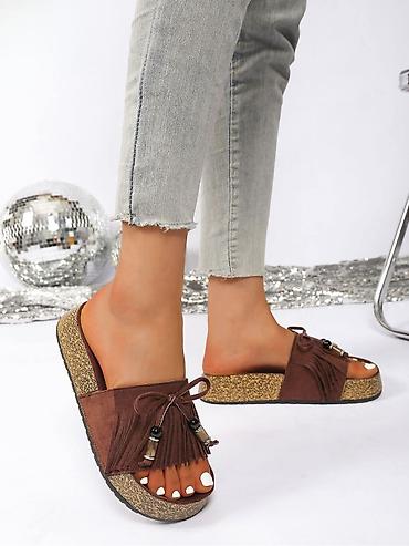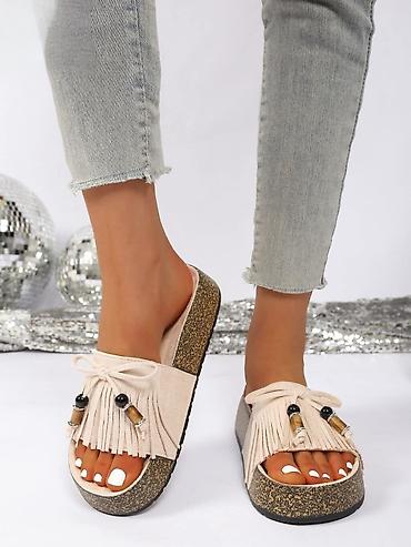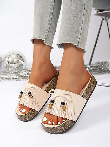 - Dizajn: otvoreni prsti, široka gornja traka sa resama, ukrasna vezica sa metalnim i perla detaljima