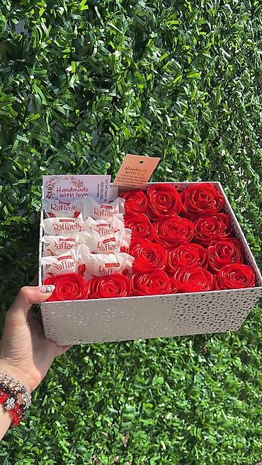 Poklon aranžman u kutiji – ručno rađene satenske ruže + Raffaello -
