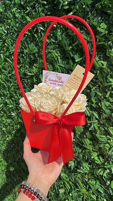 Ručni aranžman “Handmade with love” – dekorativna korpica sa ružama od satena.