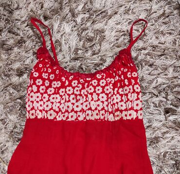 Ženska odeća – 4 komada (dimenzije i informacije sa slika) 1) Crvena košulja/haljina bez rukava - Odgovara: M–L - Dužina: 80 cm - Poluobim: 42–50 cm - Detalji: kragna sa naborima, kratki rukavi, k...2 800 RSD