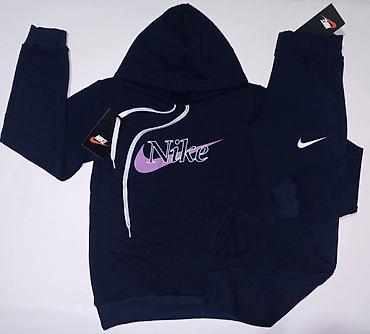 Dečiji komplet trenerke – Nike stil - Dvodeleni komplet: dukser bez kapuljače i donji deo trenerke. - Boje: bela gornji deo + teget donji deo (natpis “teget” na slici). - Dizajn: veliki NIKE logot...
