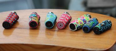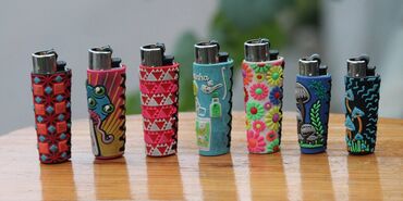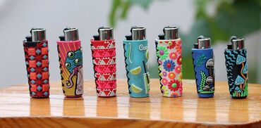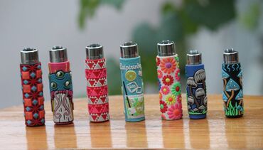 Komplet Clipper upaljača sa originalnim dekorativnim futrolama, prikazan kao celina. Svaki upaljač ima različit reljefni motiv (uključujući geometrijske uzorke, floralne motive, pa i PSIHODELIJU/ PEČURKE, citrusni i ilustrativni dizajn), sa bogatom teksturom i izraženim 3D detaljima.