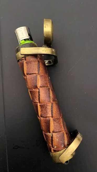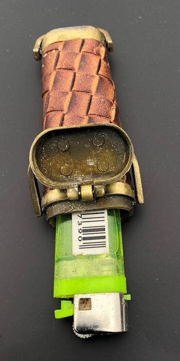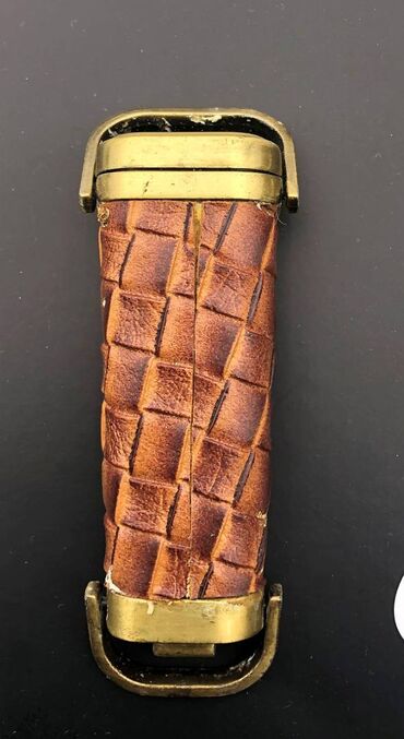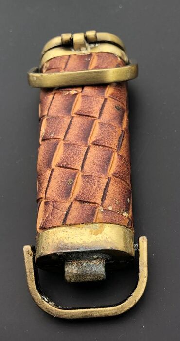 Stara futrola za upaljač izrađena od mesinga, obložena pletenom kožom. Robustna izrada, sa metalnim alkama koje ukazuju na nošenje ili kačenje uz opremu.