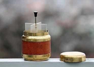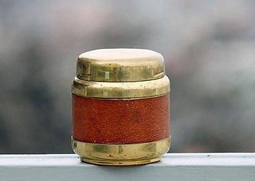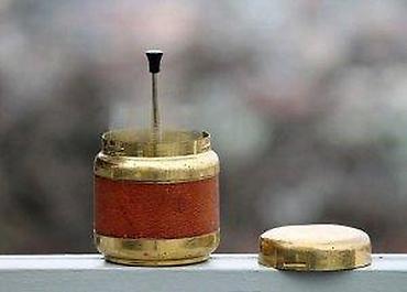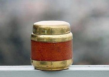 Vintage Erhard & Sohne automatska STONA tabakera. Made in Germany. Erhard &Sohne. Prekrasna, stara, STONA tabakera. Skidanjem/ blagim odvrtanjem poklopca, sadržaj se automatski izdiže - gosti izvolite poslužite se. Danas vrlo vrlo, retko i vrlo skupo (120 evra+). Dimenzije cca: prečnik 9cm; visina zatvorene tabakere 10 cm, visina otvorene tabakere 14,5 cm. Na dnu su grb i logo proizvodjača. Pogledajte fotografije, one su vitalni deo opisa. Fotografisan je upravo predmet koji se prodaje. Troškovi poštarine nisu uračunati u cenu ✨