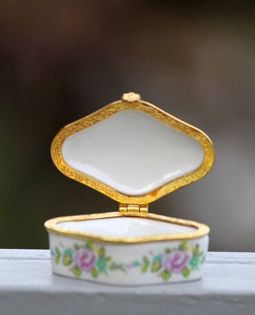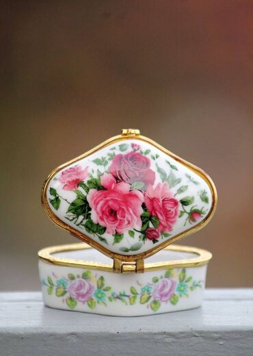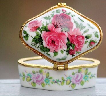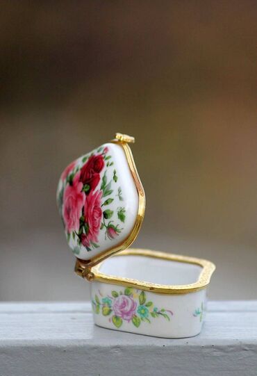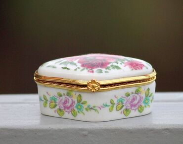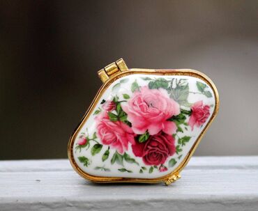 Stara porculanska burmutica sa metalnim šarkama. Motiv ruža. Dimenzije zatvorene kutije cca: 6 x 5 x 3 cm. Pogledajte fotografije - prodaje se upravo kutijice koja su fotografisana. Poštanski troškovi nisu uključeni u cenu.