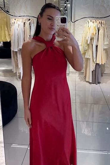 - Izrez: halter stil sa dekorativnim čvorom napred i malim prorezom