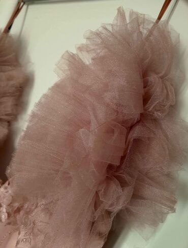 - Materijal: satenska podloga sa prekošivenim tilom i bogatim 3D cvetnim čipkanim aplikacijama; diskretne šljokice koje daju suptilan sjaj.