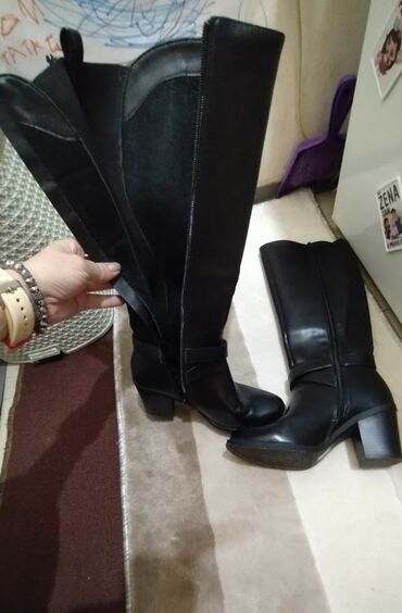 Ženske visoke čizme do kolena, crne. U savršenom stanju, nošene samo po sobi, prodajem zato što su mi male. - Materijal: gornji deo kombinacija glatke eko-kože i elastične tekstilne strane koja ...