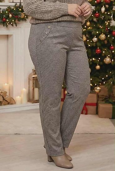 - Model 2: Svetlosive pantalone sa sitnim karo dezenom. Klasičan ravan kroj sa laganim sužavanjem ka dnu. Dekorativna dugmad sa strane na predelu kukova daju sofisticiran detalj. Elastičan pojas za komfor tokom celog dana.