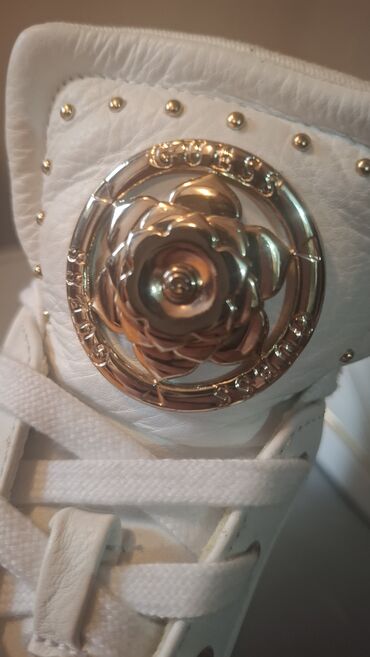 - Detalji: velika metalna ruža sa GUESS natpisom na jeziku, ukrasne nitne oko jezika i bočnih panela, dekorativna zlatna lajsna uz đon
