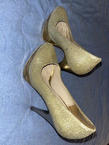 - Boja/materijal: zlatni šljokičasti/glisten materijal spolja; sjajna zlatna platforma i detalji