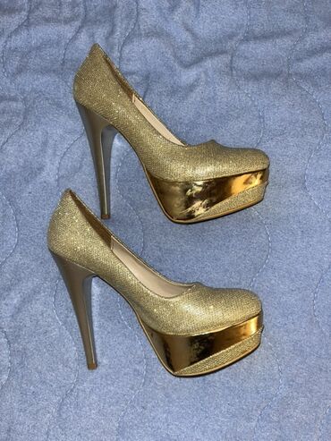 Zlatne ženske salonke sa platformom i visokom štiklom.