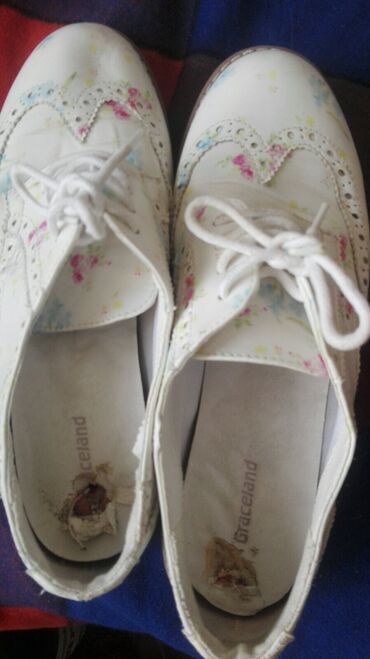 Dameće cipele sa pertlama – broj 38, dva unikatna modela. Model 1: - Šarene oksford/derbi cipele sa nižom blok petom. - Patchwork print u plavo‑zelenim i zemljanim tonovima, sa dekorativnim šarama...