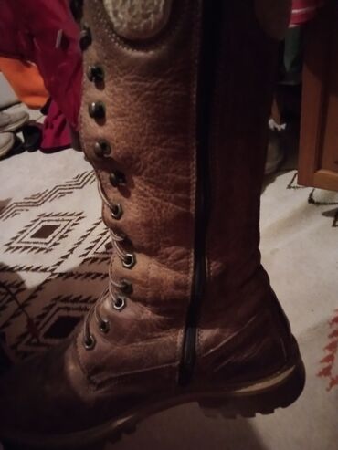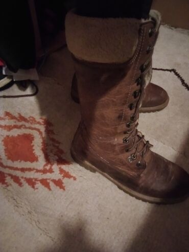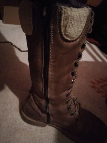Zimske čizme, crne, sa toplom krznenom postavom i dubokim profilom đona za dobro prianjanje na snegu i klizavim podlogama. Visoki model sa vezivanjem pertlama preko metalnih kukica i rupa, pruža st...