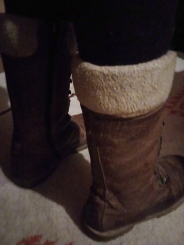 Ženske zimske čizme sa krznom, broj 39. - Boja: krem/bele gornje površine od mekog veštačkog krzna, sa smeđim đonom i donjim delom od brušenog materijala. - Vezivanje: dekorativne i funkcionalne p...