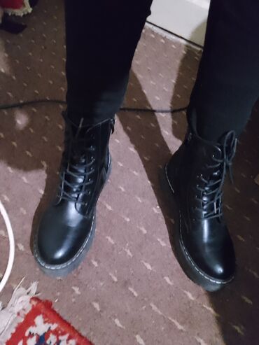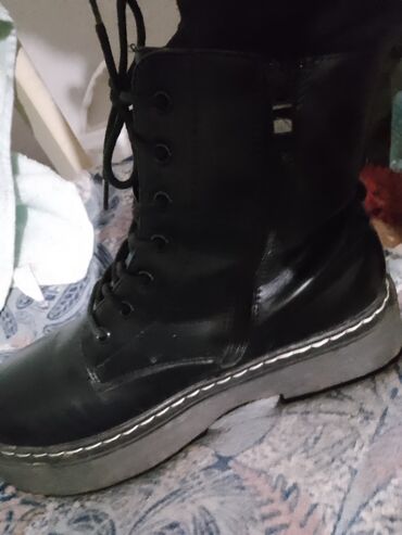 Zimske čizme, crne, sa toplom krznenom postavom i dubokim profilom đona za dobro prianjanje na snegu i klizavim podlogama. Visoki model sa vezivanjem pertlama preko metalnih kukica i rupa, pruža st...