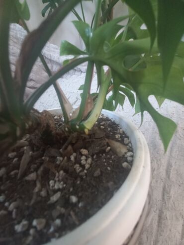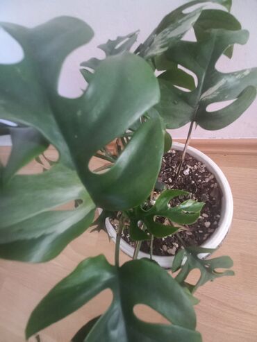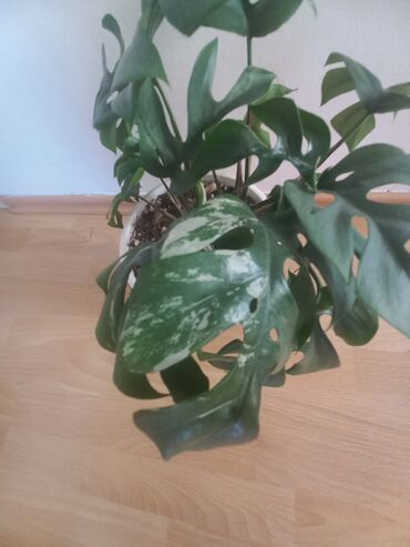 Sobne biljke – tropska kolekcija u saksijama - Monstera deliciosa: mlada biljka sa razvijenim raskošnim listovima sa rezovima, zasađena u većoj plastičnoj saksiji. Pruža se uz potporu/kolac i ima ...