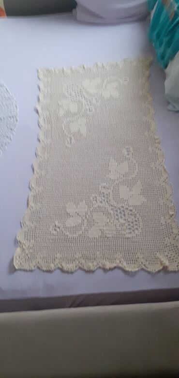 Ručni heklani stolnjaci i miljei – više modela - Tradicionalni ručni rad, nežna pamučna pređa u beloj/ekru nijansi - Motivi: cvetni i geometrijski (kvadrati, dijamanti, rozete) - Fini mrežasti vez...