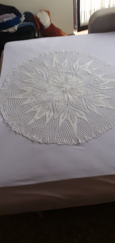 - Okrugli milje u beloj nijansi, delikatan mrežasti plet sa bogatim centralnim floralnim zvezdastim motivom koji se širi ka ivici. Diskretno talasasta završnica.