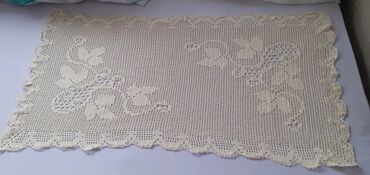 Ručno heklán stolnjak/čipkana staza za sto - Materijal: pamučni konac u beloj/ekru nijansi - Tehnika: fino heklanje, motivi povezani u mrežu sa cvetnim rozetama i obodom od ponovljenih cvetića - ...