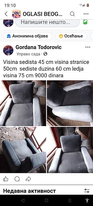 - Dimenzije (procena po fotografijama): približno širina 90–100 cm, dubina 85–95 cm, visina naslona oko 90 cm