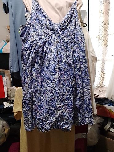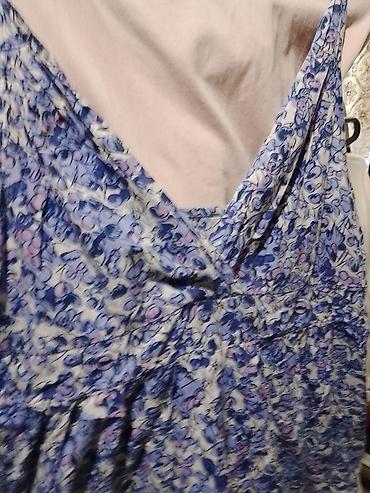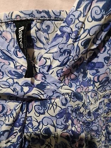 - Dizajn: sitan cvetni/abstraktni print u nijansama plave i svetloružičaste na svetloj podlozi.