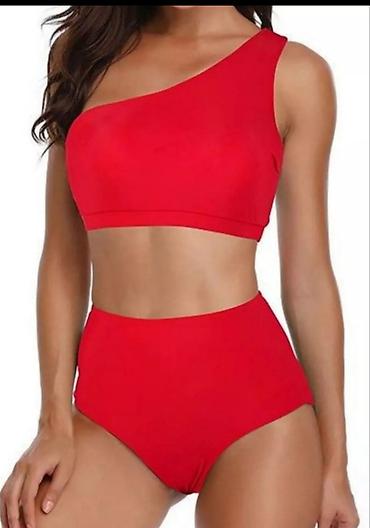 - Dvoderni kupaći u crvenoj boji: asimetričan gornji deo na jedno rame sa širokom trakom; donji deo visokog struka koji vizuelno oblikuje struk i pruža dodatnu pokrivenost.