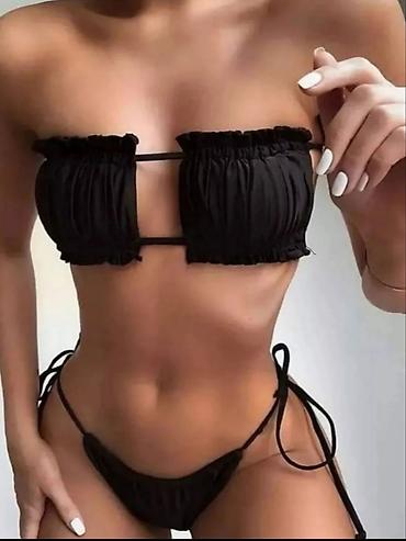 - Dvoderni kupaći u crnoj boji – minimalistički: bandeau gornji deo sa naborima i dvostrukim tankim spojem napred; donji deo sa bočnim vezivanjem uz tanke trake za podešavanje.