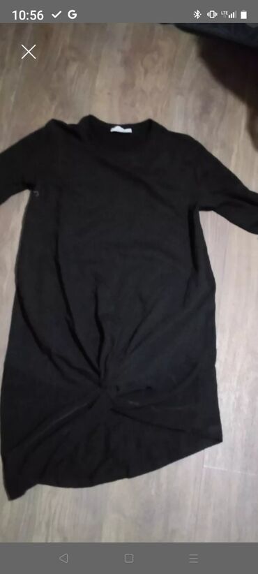 - Haljina 1: crna, midi dužina, lagana pletena tkanina sa drap detaljem/čvorom u donjem delu napred. Dugi rukavi i okrugli izrez. Udobna i pogodna za svaki dan ili večernji izlazak.