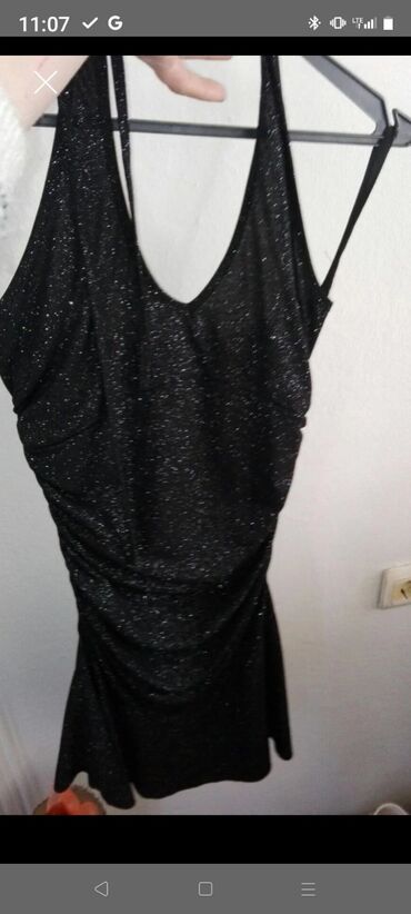 - Haljina 2: crna mini haljina sa sitnim svetlucavim šljokicama po celoj površini. Uska silueta sa naborima sa strane, tanke naramenice i V-izrez, dizajnirana za večernje prilike i proslave.