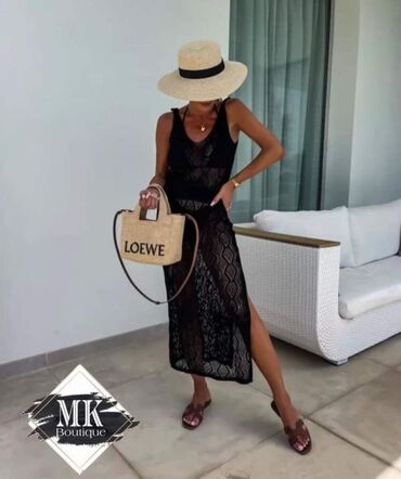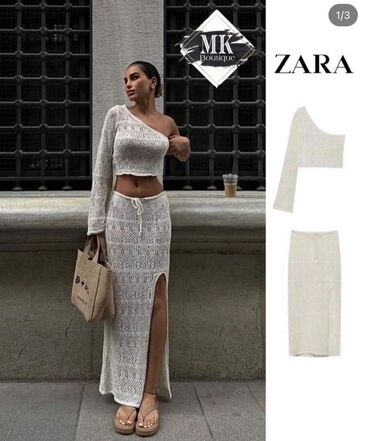 Dvodijelni ženski komplet u neutralnim tonovima (bež/ekru): - Gornji deo: bez rukava, okrugli izrez, lagan i lepršav materijal sa dvoslojnim, asimetričnim porubom koji lepo pada i prikriva liniju s...