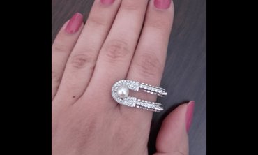 Prsten sa velikim ukrasnim delom u obliku cveta, ukrašenim nizom bisera i sitnih, sjajnih kamenčića. Dizajniran je tako da imitira cvetni aranžman, sa centralnim delom koji se ističe. Podesiv dizaj...2 600 RSD