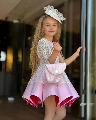 Dečija elegantna haljina – puder roze - Veličina: 12 (etiketa vidljiva na fotografiji) - Kroj: gornji deo jednostavan sa okruglim izrezom i kratkim kap rukavima; struk blago naglašen - Suknja: slo...