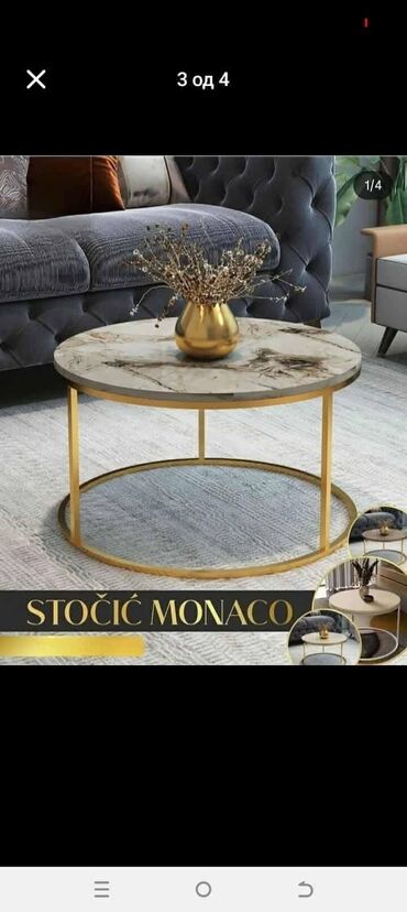 - Materijali: metalna konstrukcija sa završnom obradom u zlatnoj ili svetloj (srebrnoj) boji; gornja ploča vizuelno u efektu mermera/ston-look (različite šare – svetla, bež, siva, braon).