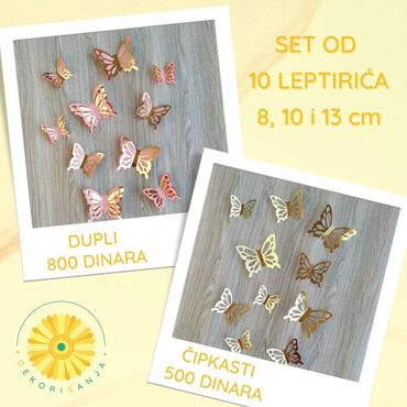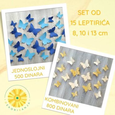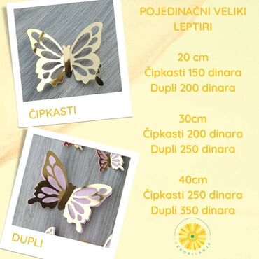 Izrada leptira of najkvalitrtnijih kartona u različitim veličinama i bojama. Dekoracija za dečiju sobu, salone lepote, i za sve vrste proslava. Više o izradi dekoracije po porudžbini na
